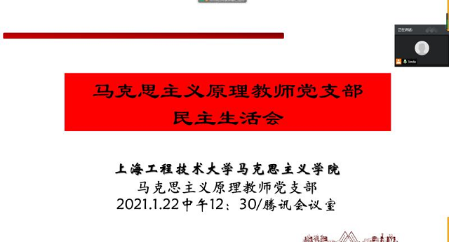2021年1月22日,马原理教师党支部开展支部党员组织生活活动,内容为“党员开展批评与自我批评”与“民主测评”,支部书记闫虹珏副教授主持活动,全体党员教师参加。