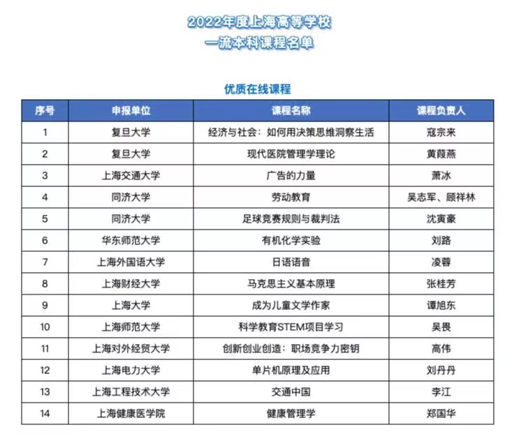2022年度上海高等学校一流本科课程名单(优质在线课程)