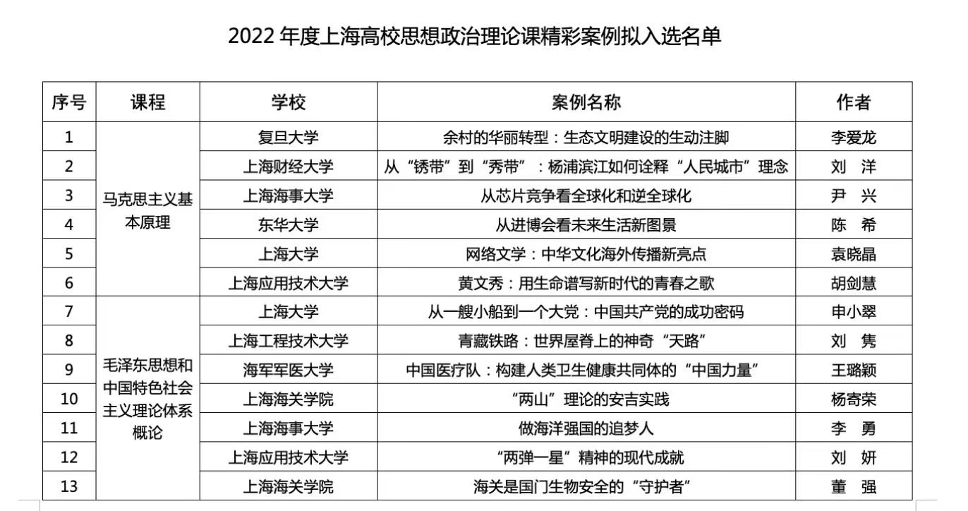 2022年度上海高校思想政治理论课“金课”、精彩案例、教师教学大比武优秀组织学校入选名单