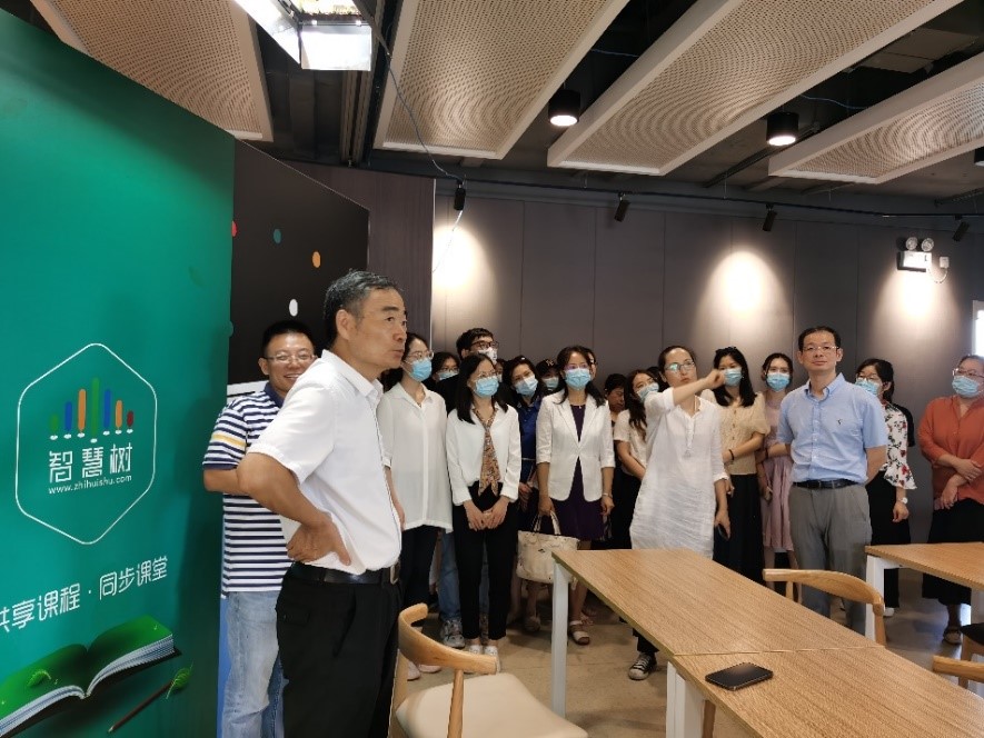 杨金华总经理、孙峥嵘经理介绍了“智慧树”公司基本情况,带领学院教师参观了办公场所,在全景教室展示了“智慧树网”的Live教学、360°实境教学、VR教学、小组教学、同步课堂等“五种教学模式”以及相关产品的应用。
