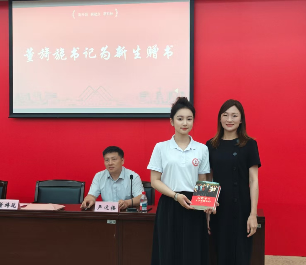 学院党委书记董旖旎为新生代表赠书,并借此启发与激励同学们:既要刻苦钻研学问、领悟信仰力量,更要坚守青年应有的赤诚与纯粹,以新时代青年马克思主义者的姿态,不忘初心、砥砺前行。随后,董书记为新生讲授开学入党启蒙教育第一课——《党章的历程》。
