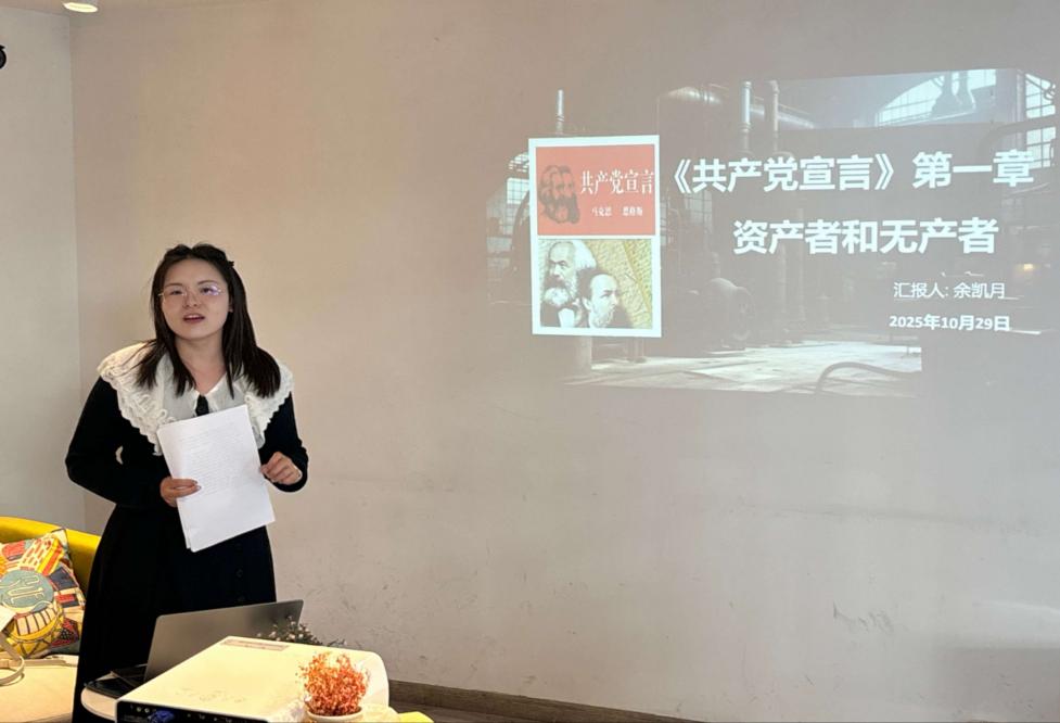 10月29日,必威BETWAY西汉姆联在程园共享学习中心开展青马读书会《共产党宣言》研读课堂第二讲,2025级研究生及青马研习社成员参加活动,余凯月老师带领大家共同学习《共产党宣言》第一部分:资产者和无产者。