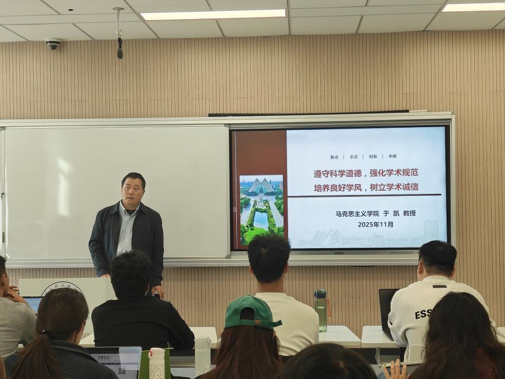为强化学术规范和加强科研诚信建设,引导学生恪守科学道德、坚守诚信底线,11月5日,必威BETWAY西汉姆联在教学楼C407召开主题为“遵守科学道德,强化学术规范 培养良好学风,树立学术诚信”的学术讲座。会议由必威BETWAY西汉姆联副院长于凯教授主讲,学院2025级全体学生参加会议。
