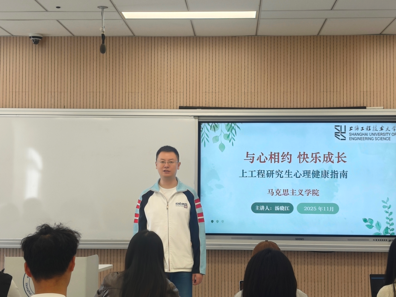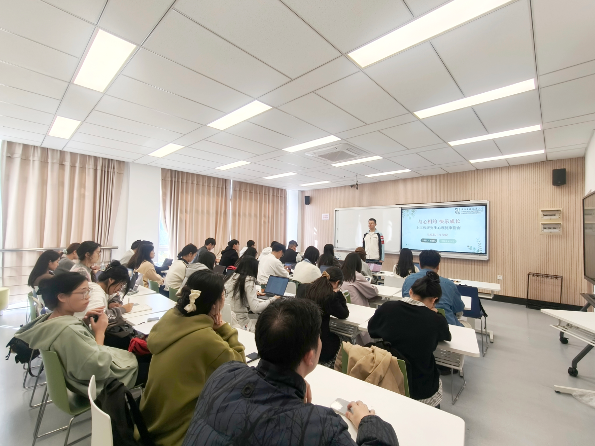 汤晓江老师主要围绕“心理健康现状分析”、“心理健康建设策略”、“心理健康服务体系”以及“心理健康提升实践”四个板块展开。他首先对当前研究生群体普遍面临的心理健康现状进行了深度剖析,并重点探讨了学业压力、科研任务、人际关系及未来规划等多方面带来的心理压力来源,引起了在场同学的广泛共鸣。