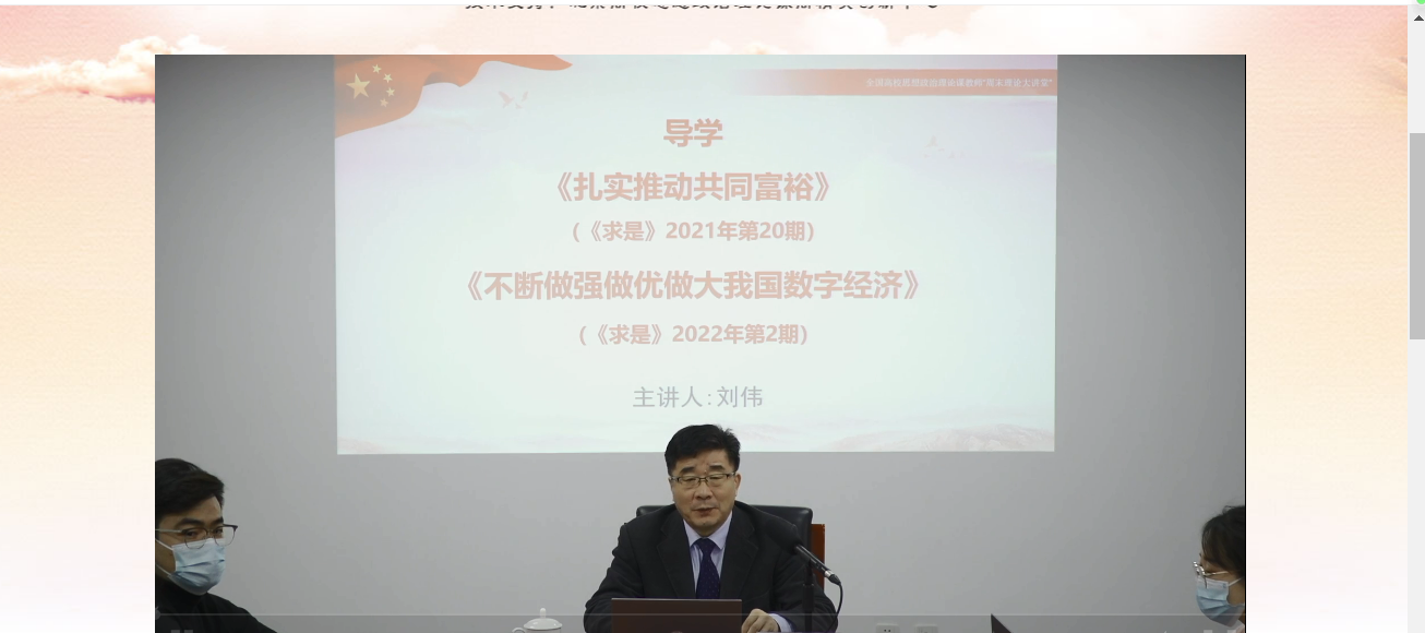 2022年3月25日14点半,马克思主义原理教研集体收看“周末大讲堂”,,讲座邀请了中国人民大学刘伟校长,通过导学习近平总书记两篇重要讲话《扎实推进共同富裕》、《不断做优做强做大我国数字经济》,对当前我国经济形势进行分析。刘校长细致讲解了当下推进共同富裕的基本原则、根本立场、总的思路以及实践要求、政策选择等内容,分析了党的十八大以来,党中央高度重视发展数字经济,将其上升为国家战略的国际背景、国内需求以及中国数字经济未来发展方向,大家都表示受益颇多,接下来还有继续系统自学,并努力将学习心得融入思政课教学内容中。