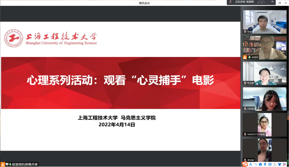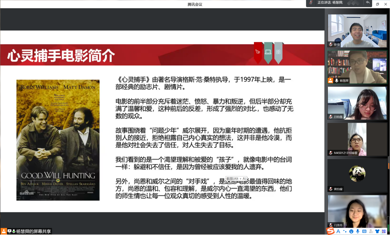 抗疫期间,为进一步丰富同学们的心理知识和课余生活,引导马院研究生更好地“接纳自己怀抱他人”,做好疫情防控期间的心理调适。4月14日晚,必威BETWAY西汉姆联组织开展系列心理活动——师生共同观看《心灵捕手》电影活动。活动由心理辅导员杨慧舜老师主持,全体研究生参加了本次活动。