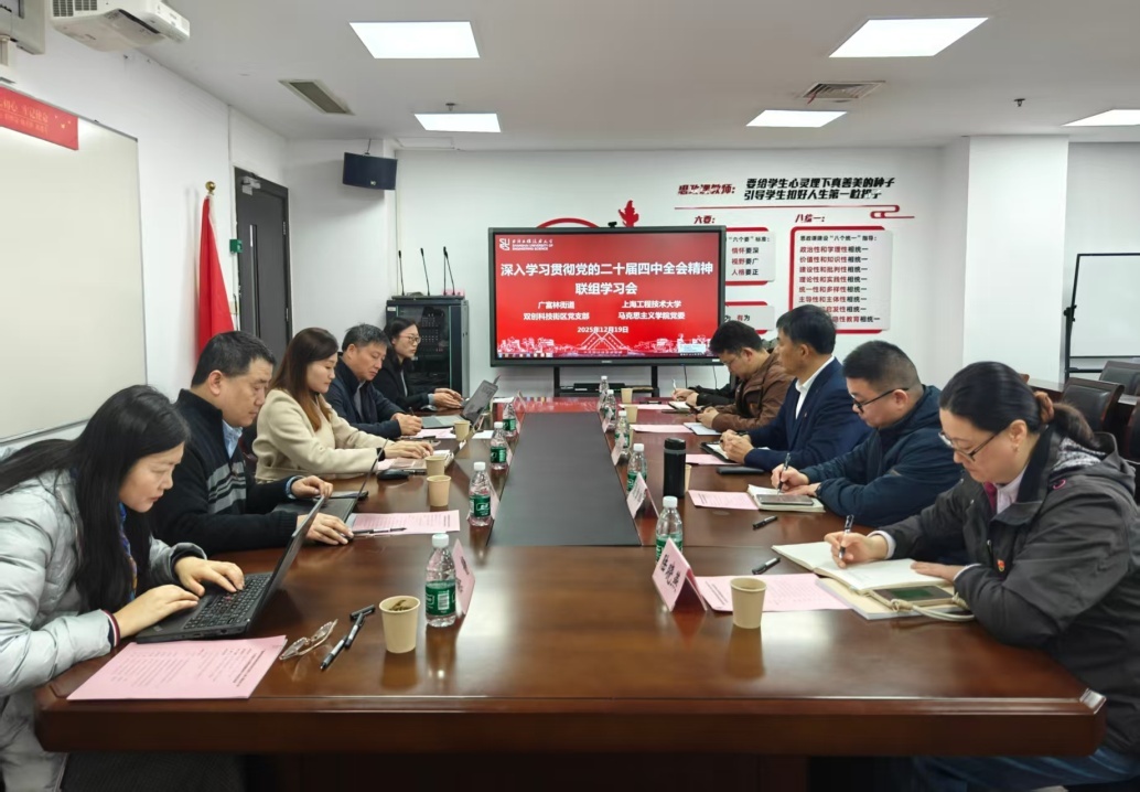 为深入学习贯彻党的二十届四中全会精神,推动理论学习与基层实践同频共振,12月19日上午,必威BETWAY西汉姆联党委与广富林街道双创科技街区党支部在行政楼1112会议室举办了专题联组学习会,双方党员干部及党员代表参加会议。会议由学院党委书记董旖旎主持。