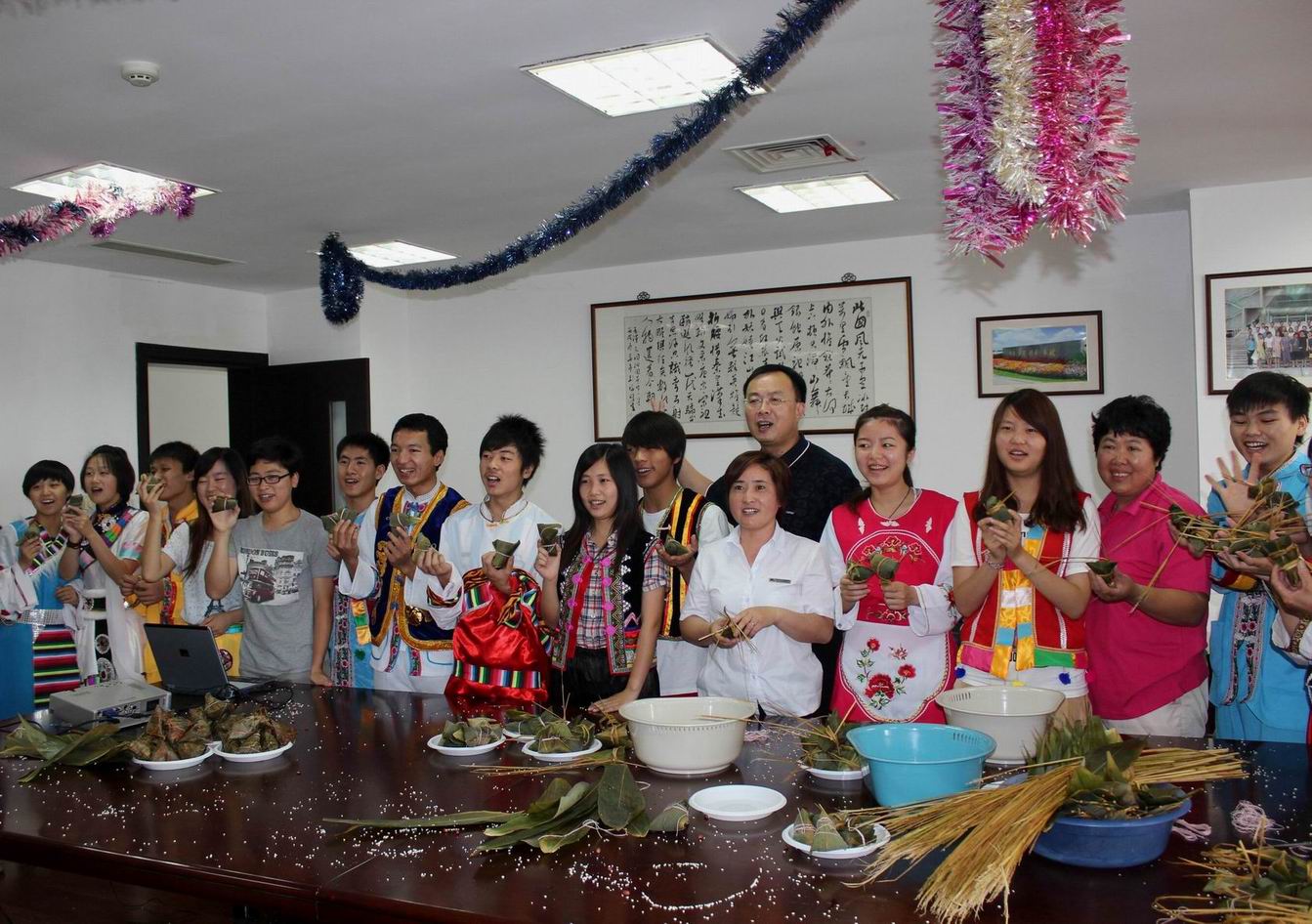 上午11点,全体民族学生、部分老师和后勤工作人员一起在行政楼712室举行了其乐融融的包粽子比赛。通过亲手制作粽子,民族学生们感悟颇多。土家族的杨亚鑫同学表示,这是自己第一次包粽子,觉得非常有成就感,他感谢学校、社会科学学院给予少数民族学生的这种民族大家庭的温暖。活动最后,少数民族学生围绕入校以来的生活学习等问题,与老师进行了深入的交流。