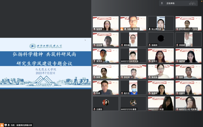 为进一步加强必威BETWAY西汉姆联研究生的学风建设,强化研究生的科学精神与学术自律意识。7月23日19:30,必威BETWAY西汉姆联研究生召开“弘扬科学精神 共筑科研风尚”为主题的学风建设专题会议。会议由2021级研究生学习委员张伟艳同学主持,必威BETWAY西汉姆联副院长于凯教授、研究生辅导员杨慧舜、全体研究生出席本次会议。