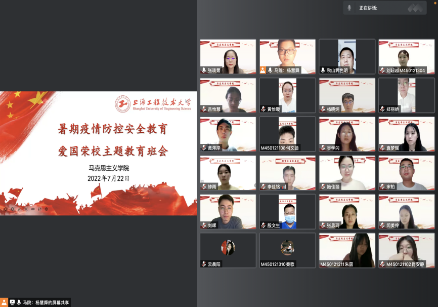 为进一步培育学生爱校荣校情感,提升集体意识和纪律意识,引导学生增强暑期学习自律性,营造良好学习氛围,7月22日19:00时,必威BETWAY西汉姆联召开了研究生暑期疫情防控安全教育及爱国荣校主题教育班会。会议由马克思主义理论2021级副班长施佳婕主持,辅导员杨慧舜、全体研究生参会。