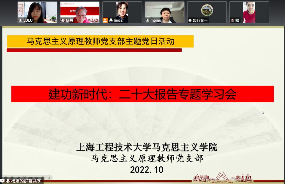 为深入学习贯彻党的二十大精神,10月28日,必威BETWAY西汉姆联马原教师党支部以线上会议方式开展了“建功新时代:二十大报告专题学习会”主题党日活动,马克思主义基本原理教师党支部全体党员及教研室全体教师参与学习。本次学习活动由支部书记闫虹珏老师主持。