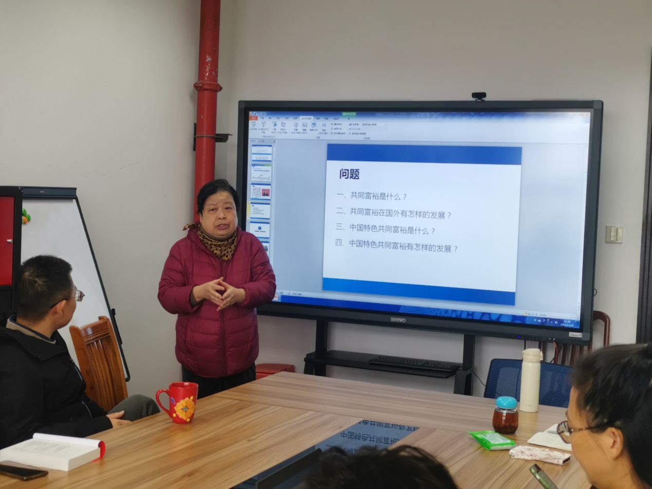 支部党员杨莲秀老师引领本次学习,她为支部全体党员和马原教研室全体教师们作了题为《中国特色共同富裕理论与实践研究》的报告。杨莲秀老师首先提出了共同富裕是什么?共同富裕在国外有怎样的发展?中国特色共同富裕是什么?中国特色共同富裕有怎样的发展?四个问题。接下来,她从共同富裕的理论基础出发,横向对比了中西方共同富裕理论的发展,纵向梳理了中国特色共同富裕的发展脉络,深刻解读了习近平总书记在二十大报告中关于共同富裕的讲话内容。关于共同富裕的理论基础,杨老师重点讲述了空想社会主义思想家和马克思恩格斯的共同富裕思想的生成逻辑、核心要义。关于共同富裕在国外的发展,她主要阐述了当代西方经济学对反贫困问题的研究,包括福利经济学、公平优先论、发展经济学等主要观点,以及二战后反贫困理论的发展。关于共同富裕在中国的理论与实践发展,杨老师对建党初期的共同富裕,共同富裕的首次提出、接续发展、深入发展进行了逻辑梳理,重点强调了新时代中国特色共同富裕思想的基本内涵、总体思路、四个原则、具体举措。