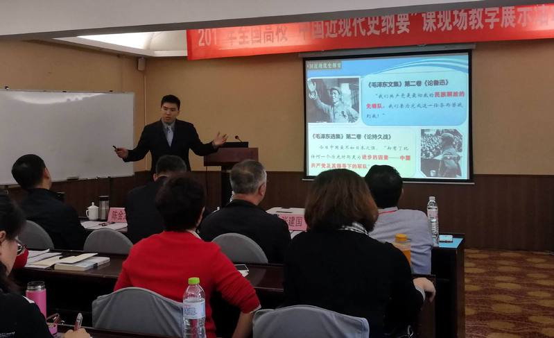 为深入学习领会党的十九大精神,贯彻落实教育部《2017年高校思想政治理论课教学质量年专项工作总体方案》,10月28日至29日,全国高校“中国近现代史纲要”课现场教学展示活动在青岛科技大学举行。活动由南开大学研究生院院长纪亚光教授主持。教育部高校社科发展研究中心主任王炳林教授、北京大学仝华教授、清华大学王宪明教授、华东师范大学宋进教授等15所大学的名家学者参加活动并担任评委。来自全国高校的58位教师登台竞技、尽显才华。