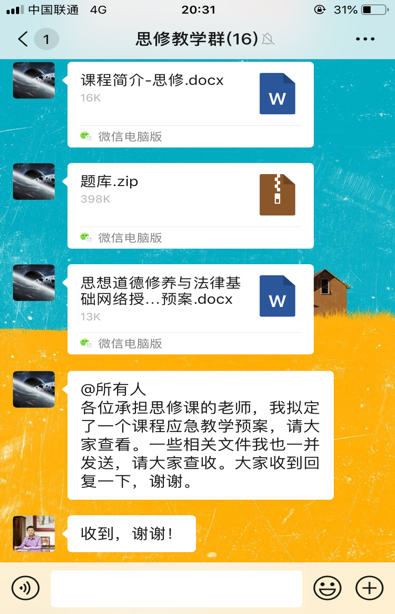 学院所有开课教师认真落实并坚持工作原则,按照工作要求顺利开展在线教学。开课前,各教研室主任会就教学内容选定及教学进度做交流与同一规范,如思修教研室主任马可老师会在思修教学群内统一在线授课进度,并提供相关题库、讨论主题等供授课老师参考。