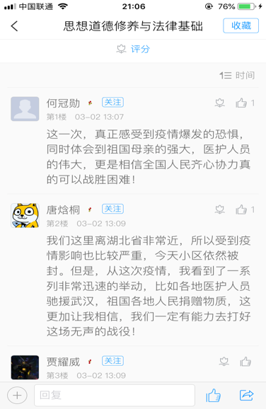 为充分发挥思政课对学生的思想引领作用,开课老师们围绕“疫情防控”主题,上好在线教学第一堂思政课。将防疫抗疫中涌现的先进人物、典型事迹作为教学案例融入思政课教学,不断增强思政课线上教学效果,坚定师生打赢疫情防控战的信心。